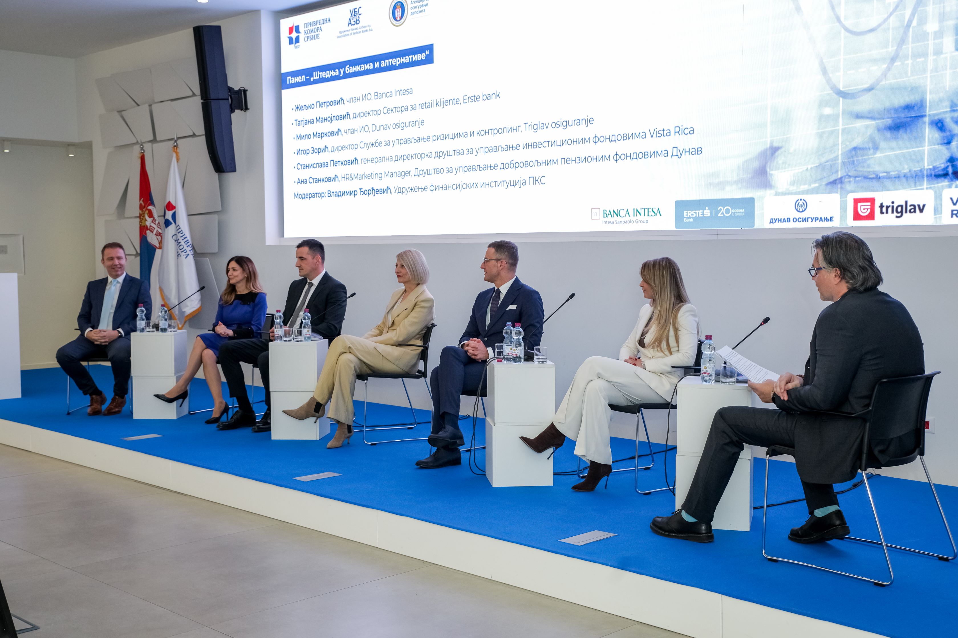 У панел-дискусији посвећеној штедњи у банкама и њеним алтернативама говори су Жељко Петровић, члан Извршног одбора и директор Дивизије за пословање са физичким лицима и малим бизнисом Banca Intesa; Татјана Манојловић, директорка Сектора за грађанство Ерсте банке; Мило Марковић, члан Извршног одбора Дунав осигурања; Игор Зорић, директор Службе за управљање ризицима и контролинг Триглав осигурања; Станислава Петковић, генерална директорка Друштва за управљање инвестиционим фондовима Виста Рика, и Ана Станковић, директорка Сектора за људске ресурсе и маркетинг Друштва за управљање добровољним пензионим фондовима „Дунав“. Модератор панела био је Владимир Ђорђевић из Удружења финансијских институција Привредне коморе Србије.